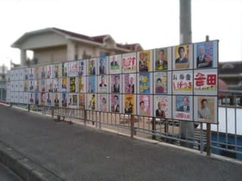 ずらりと並んだ選挙ポスター。うちのような所も今年はじめ市町合併で「市」になった。4つの町の合併なので、今は議員さんが新しい議場にあふれている。今回は合併後、初めての選挙なので、28の議席をめざし50名が立候補。このように掲示板は巨大だ。そう、…