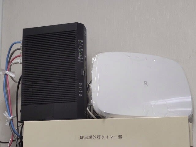 あれ?パソコンがネットにつながらないぞ?ネットはケーブルテレビじゃないのにという事で光ファイバーが入っているONU(光回線終端装置)を見に行きます。ここに並んでいるONUと無線LANを兼ねた楽天Casaのランプがみんな消灯?しています。もちろん停電はしていません。